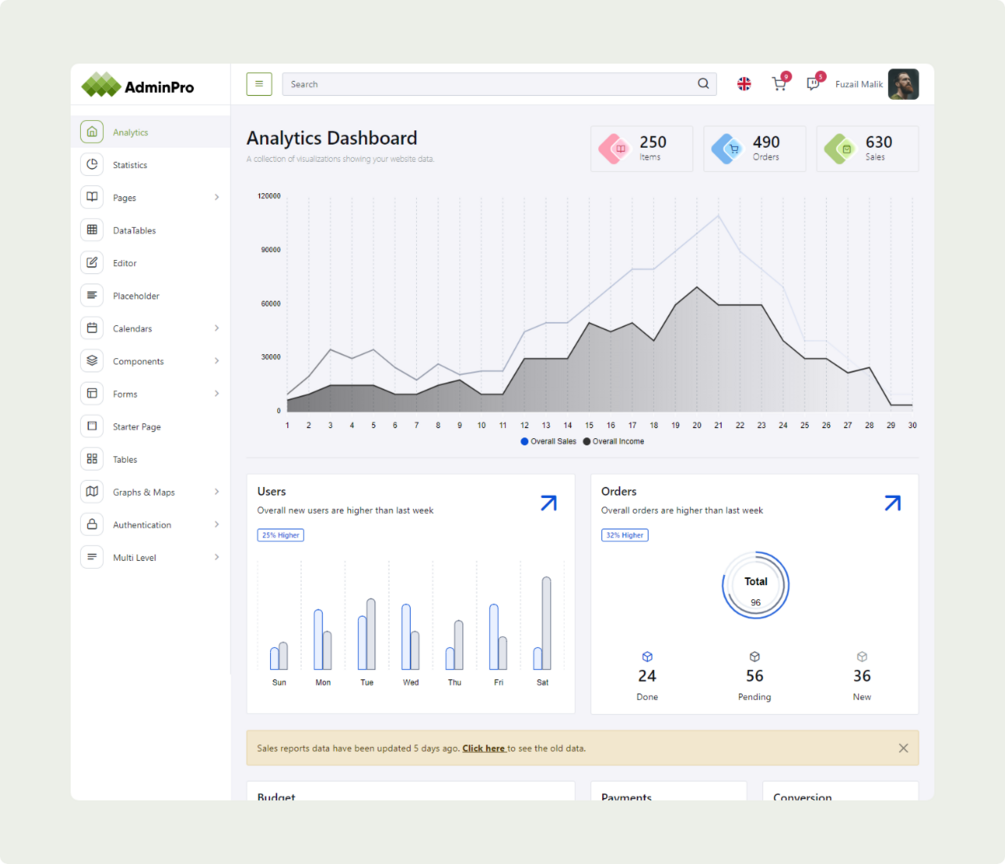 AdminPro is the best premium admin template built with the latest Bootstrap 5. It is a clean and unique design concept that comes with glossy SVG icons. The graphs are customized by using CSS. The color scheme was selected from Adobe color schemes. All the HTML pages are well-commented and documentation is included. By default, the AdminPro Admin Dashboard comes with Analytics and Statistics dashboard options. You can start your project by choosing Starter Page HTML. Some special pages include Quill Editor, Calendars, DataTables, Apex Graphs, Invoices, Subscribers, and User Profile. All the reusable components are created.