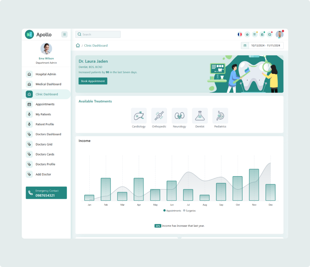 Apollo is a Bootstrap-based Medical admin template designed to provide a clean, modern, and responsive user interface for healthcare professionals. It offers a variety of pre-built components, pages, and layouts that can be easily customized to suit specific needs. Apollo admin dashboard is using the Bootstrap framework, this template offer a user-friendly interface, making it easy for healthcare professionals to manage patient records, appointments, billing, and other essential functions. It comes with FOUR unique dashboards.