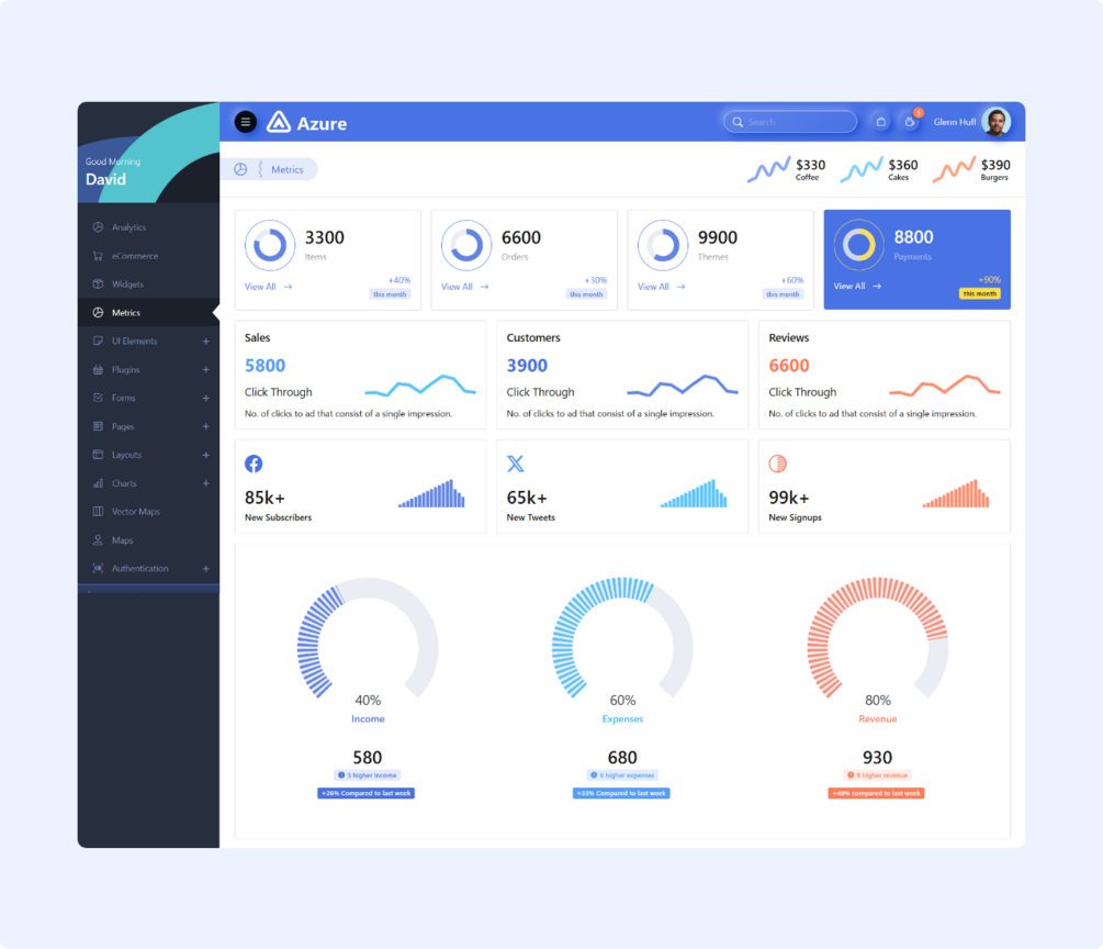 Built with Bootstrap 5, Azure offers a clean UI, pre-built layouts, reusable components, and data-rich analytics allowing you to focus on functionality without worrying about design.