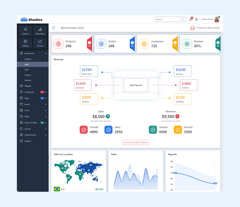 Bluedox - Premium Bootstrap 5 Admin Dashboard template comes with new, and attractive designs and ready-to-use layouts. It is designed by using the latest Bootstrap v5.3 and jQuery. It comes with Five unique dashboard pages. Each dashboard has unique features. It has seven different pre-designed layouts that can be used to create any type of dashboard or web application. It has plenty of custom-ready widgets and components. We have included inline comments on all HTML pages. Its a clean design, wide range of widgets, charts, and UI components.