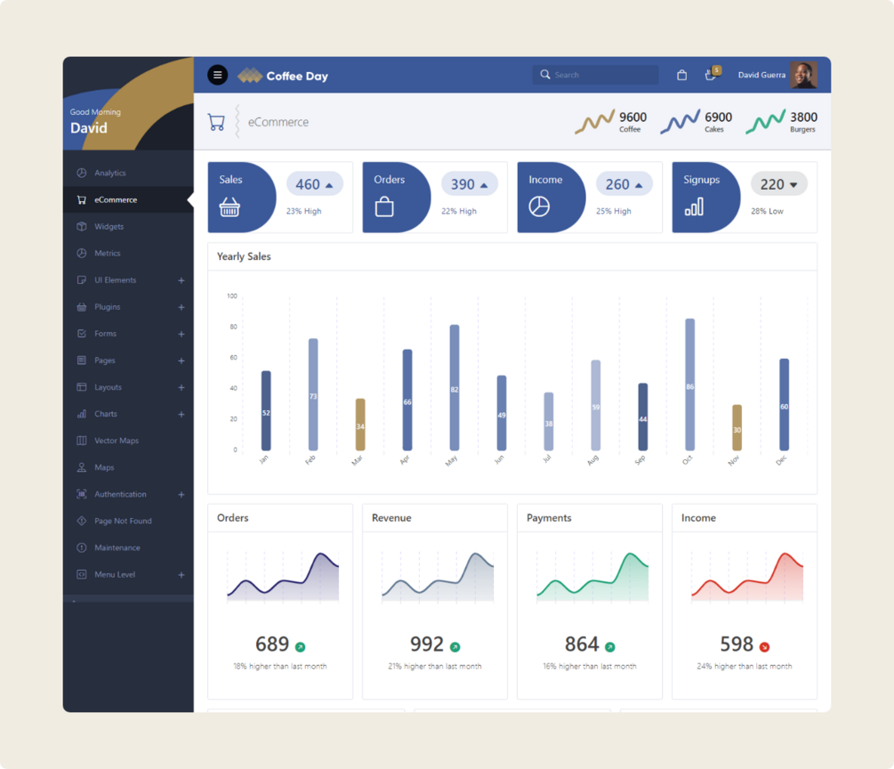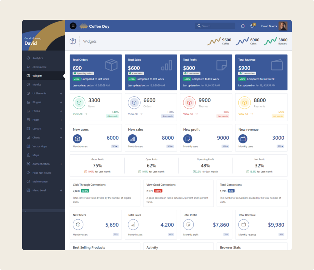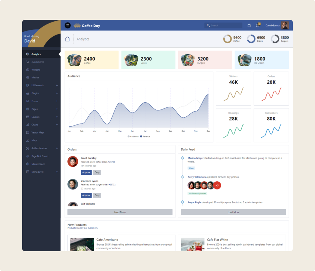 Coffee Day is the ultimate Bootstrap admin template, designed to empower developers and businesses with a robust, flexible, and highly customizable solution for building responsive, feature-rich web applications. Whether you're developing a simple dashboard or a complex enterprise system, Coffee Day provides all the tools you need to create stunning, functional interfaces effortlessly.